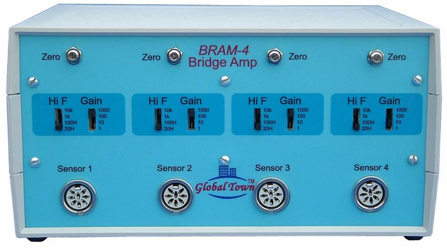 four-channel bridge amplifier, BRAM-4B, features low-noise, low-drift, differential